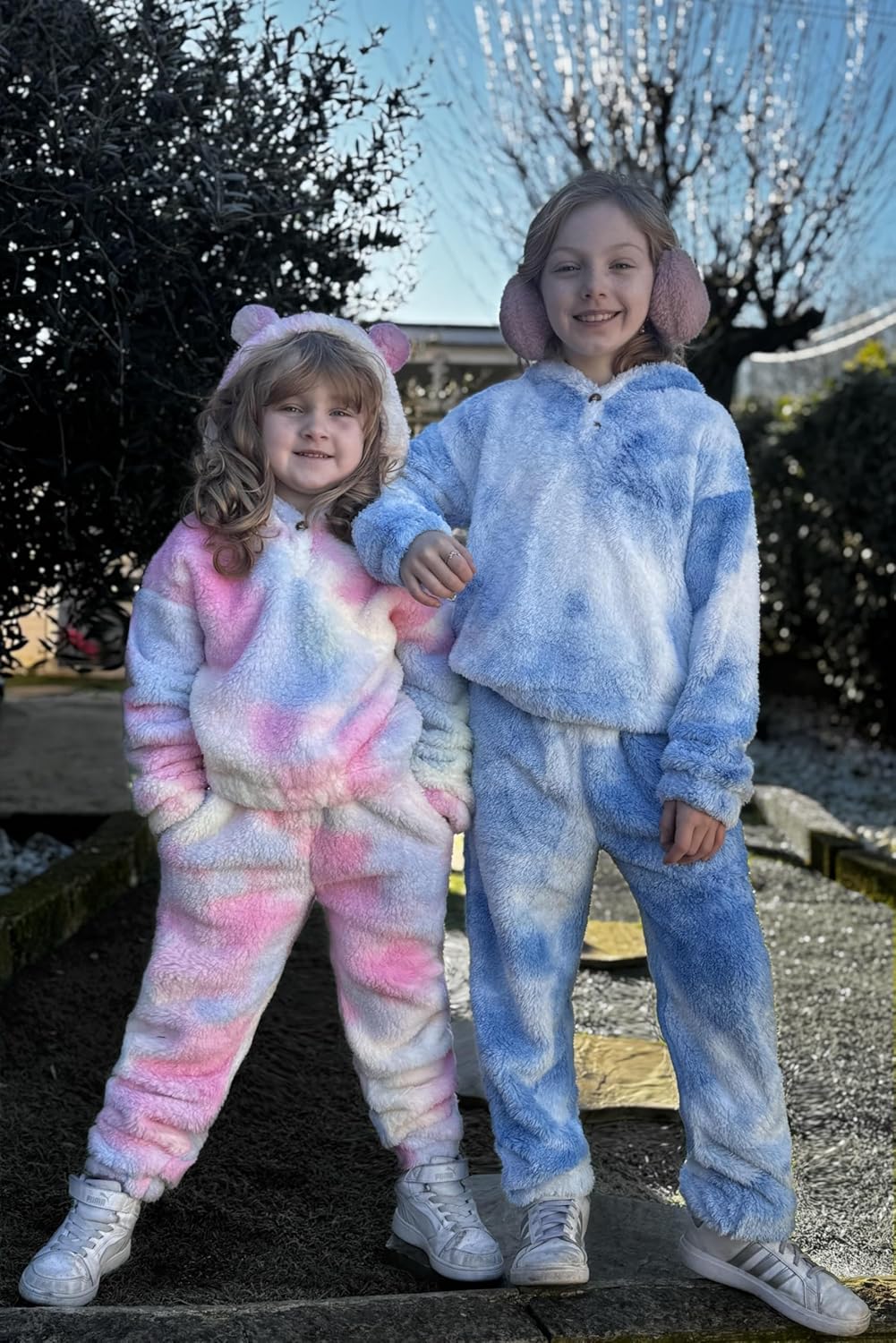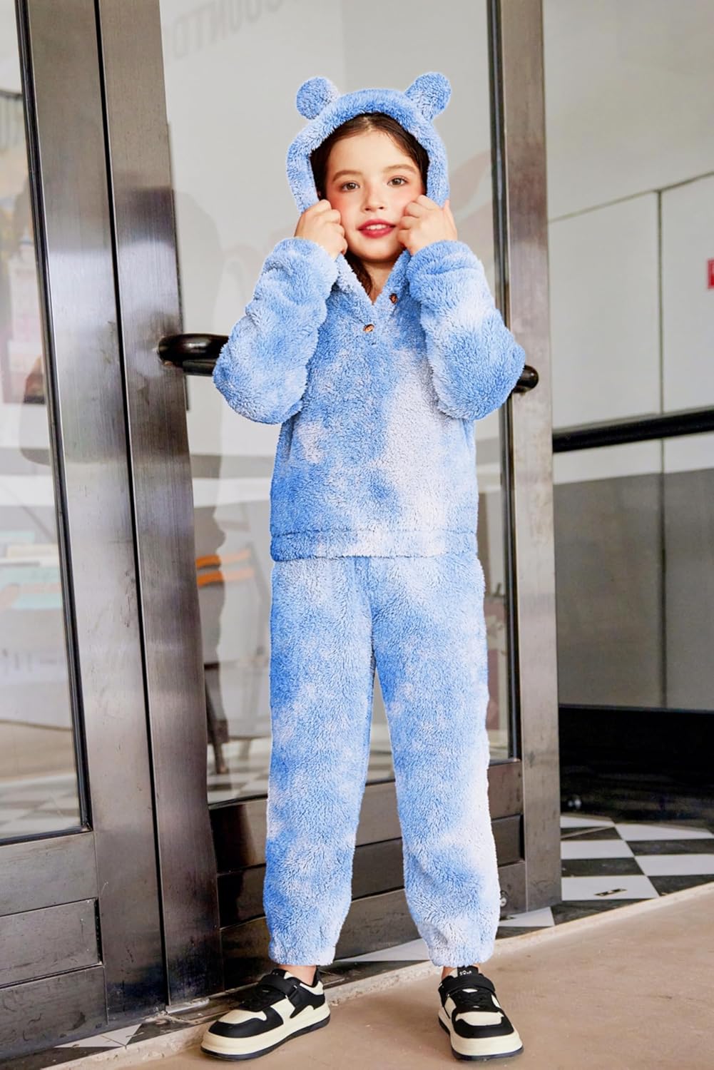 Customers find the sweatshirt and sweatpants set super soft and perfect for cold weather, with one customer noting it maintains its fluffiness after multiple washes. The outfit is cute, well-made, and comfortable, making customers feel cozy. While some customers say it’s true to size, others find it too small. The color receives mixed feedback, with several customers comparing it to a teddy bear.