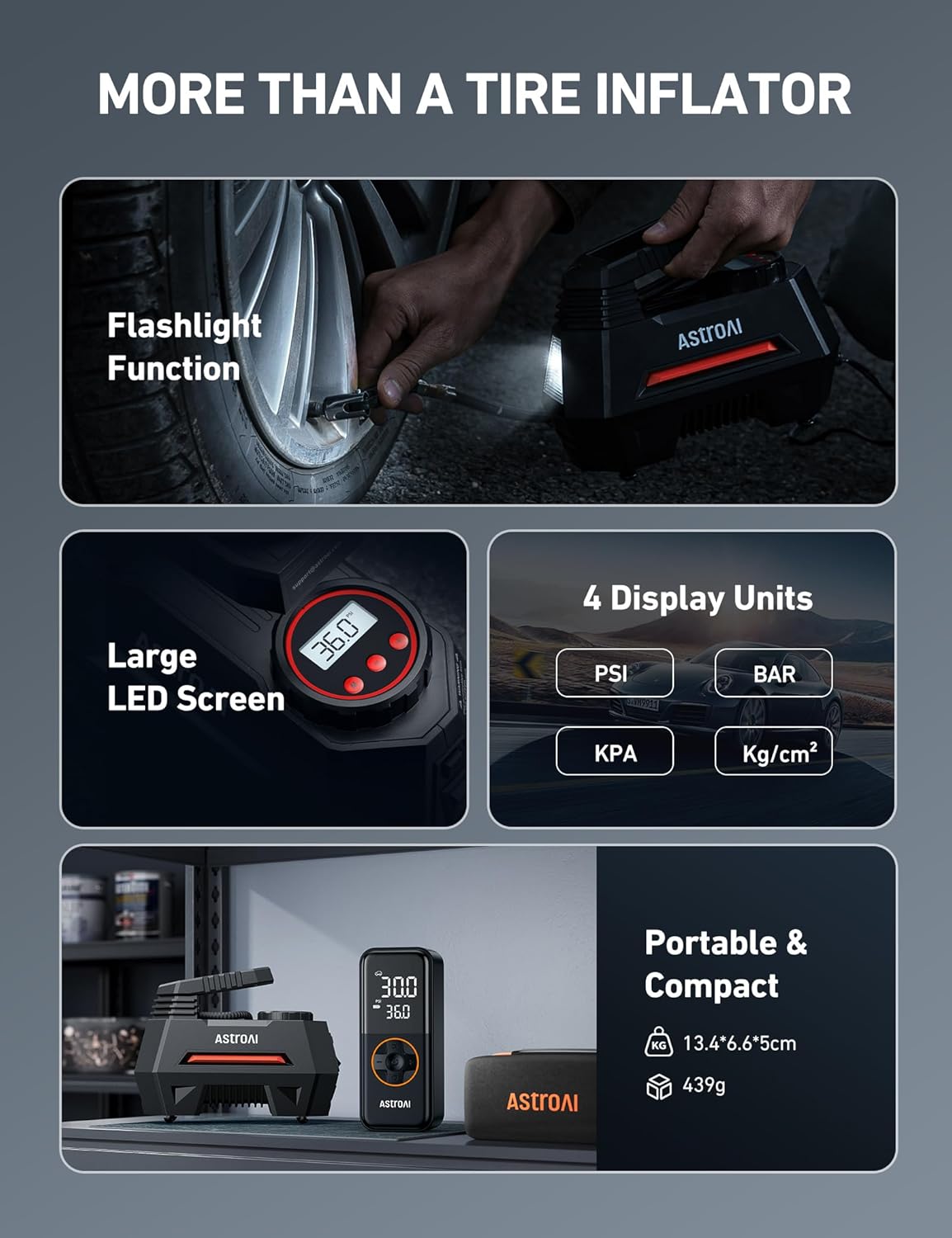 EASY NIGHTTIME USE: Equipped with a backlit screen and a flashlight, this tire inflator brings convenient use, even in dim environments. Its independent LED Button enables one-press flashlight operation. Great gifts for men and women.