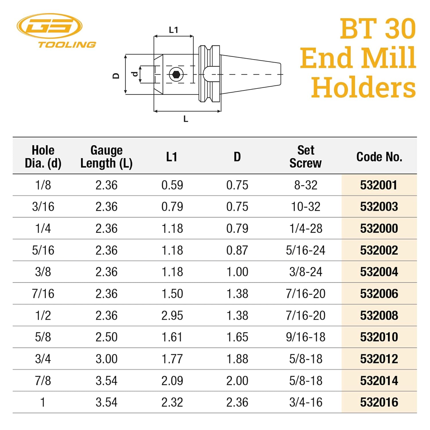Engineered for performance and durability, the BT30 3/4″ x 3.00″ End Mill Holder delivers exceptional tool stability for high-speed CNC applications. Manufactured from high-grade alloy steel and precisely ground to ensure optimal concentricity, this end mill holder is ideal for applications that demand accuracy and repeatability.Whether you’re machining with miniature end mills or carrying out high-precision finishing tasks, this BT30 tool holder offers a secure, vibration-free grip. Its .00″ projection provides ample reach while maintaining rigidity, making it a dependable choice for industrial and professional machining settings.Backed by GS Tooling’s commitment to quality and compatibility with all standard BT30 spindle tapers, this end mill holder is a must-have for any serious CNC tooling setup.