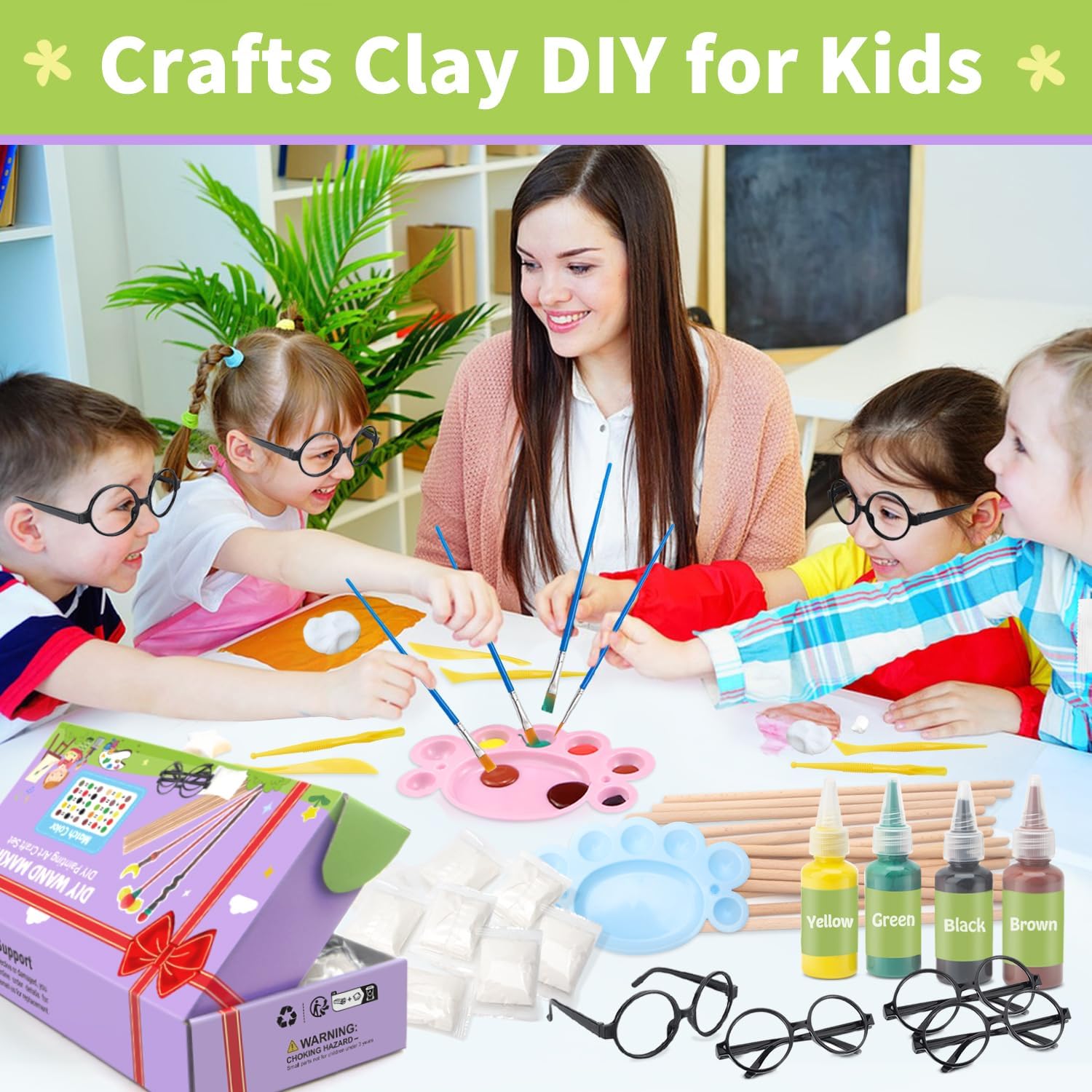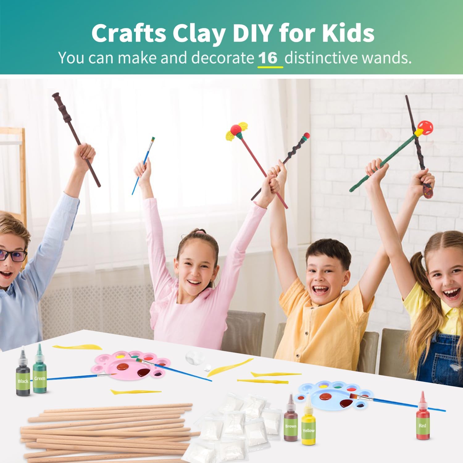 Popular Art Craft Set:The craft kit includes 16 x wizard glasses frame,16 x wooden craft wands,16 x white ultralight clay,5 x acrylic paints(black, brown, yellow, green, red), 2 x palette, 6pcs clay tools,4 x flat-tipped brushes and 2 x pointed brushes.—Note:The finished wand in the picture is a schematic diagram of the effect for your reference. The stick you receive needs to be combined with clay to make the wand you want.