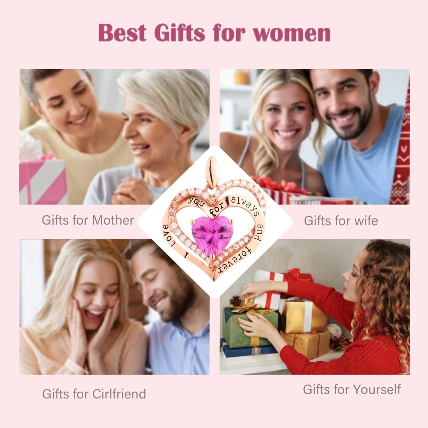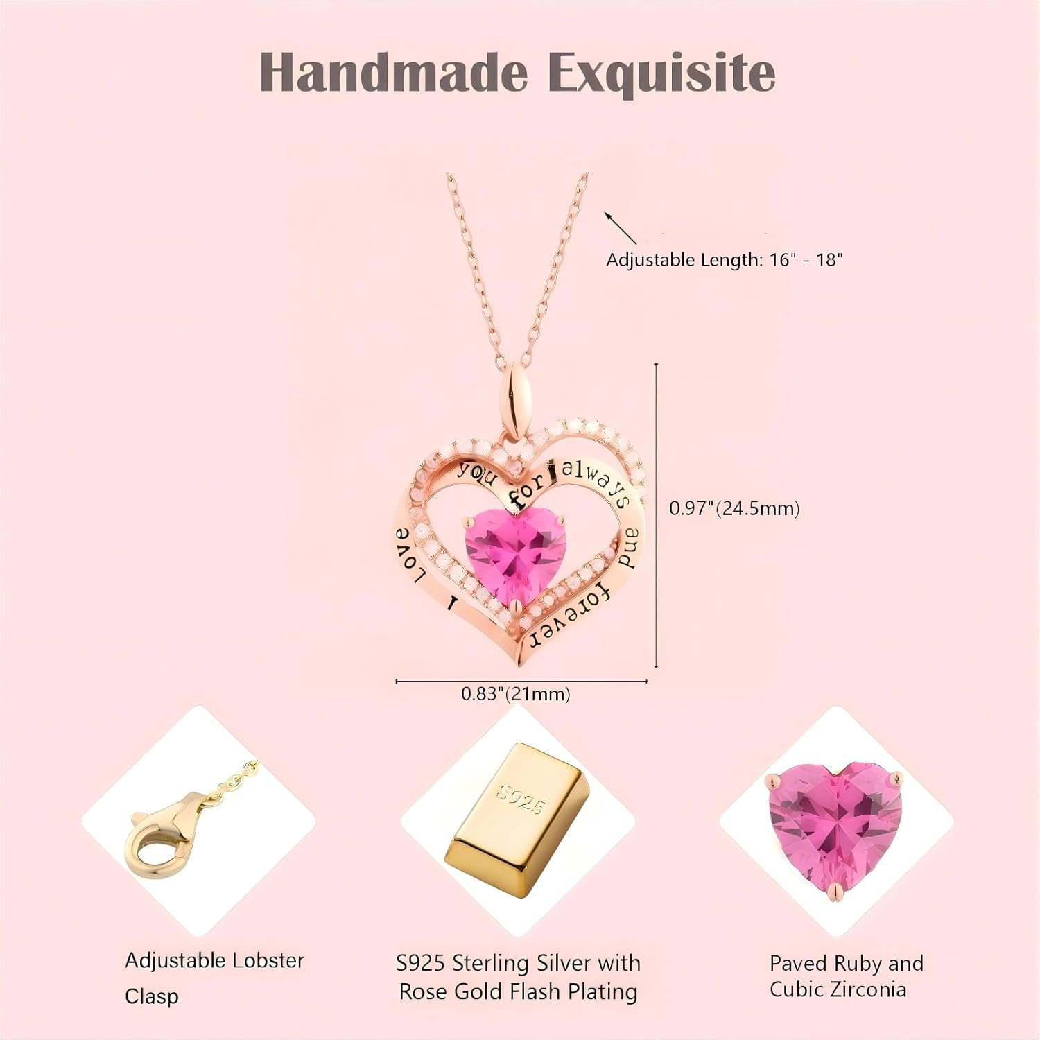 Dainty Double Heart Pendant Necklace with Ruby&Cubic Zirconia, Engraved “I Love You For Always and Forever” S925 Sterling Silver 14K Rose Gold Plated Necklace for Women, Meaningful Gift for Her, Valentine’s Day, Anniversary