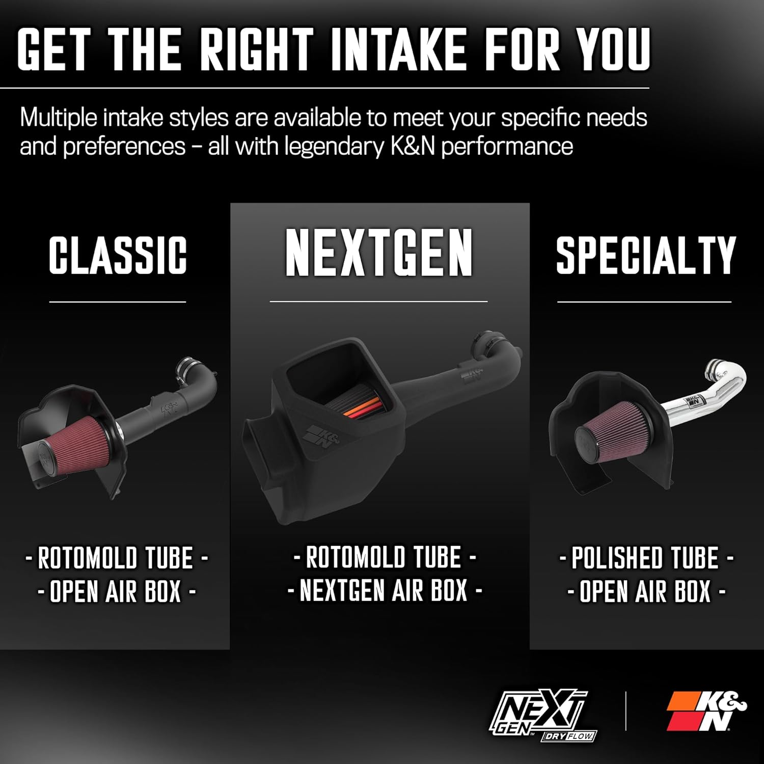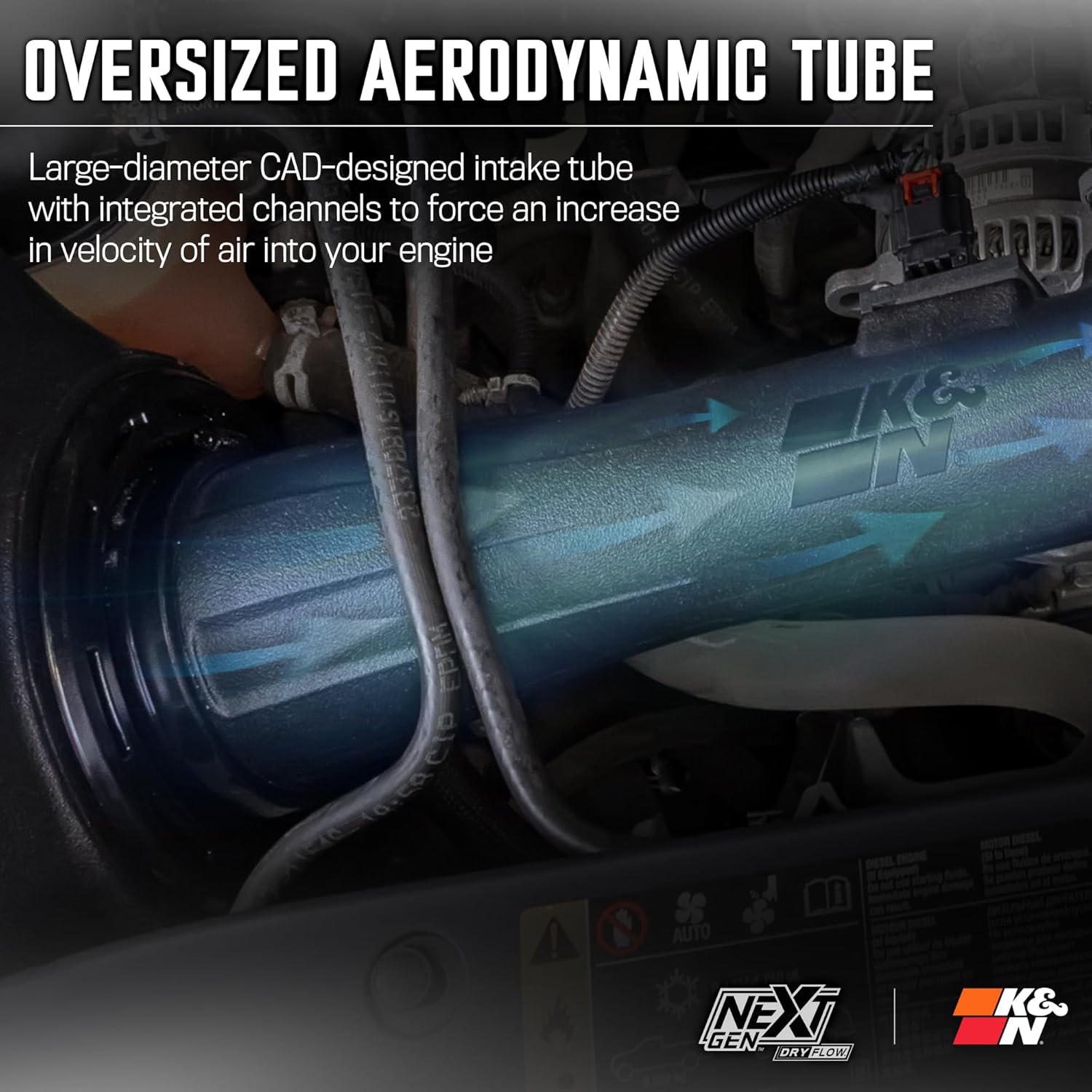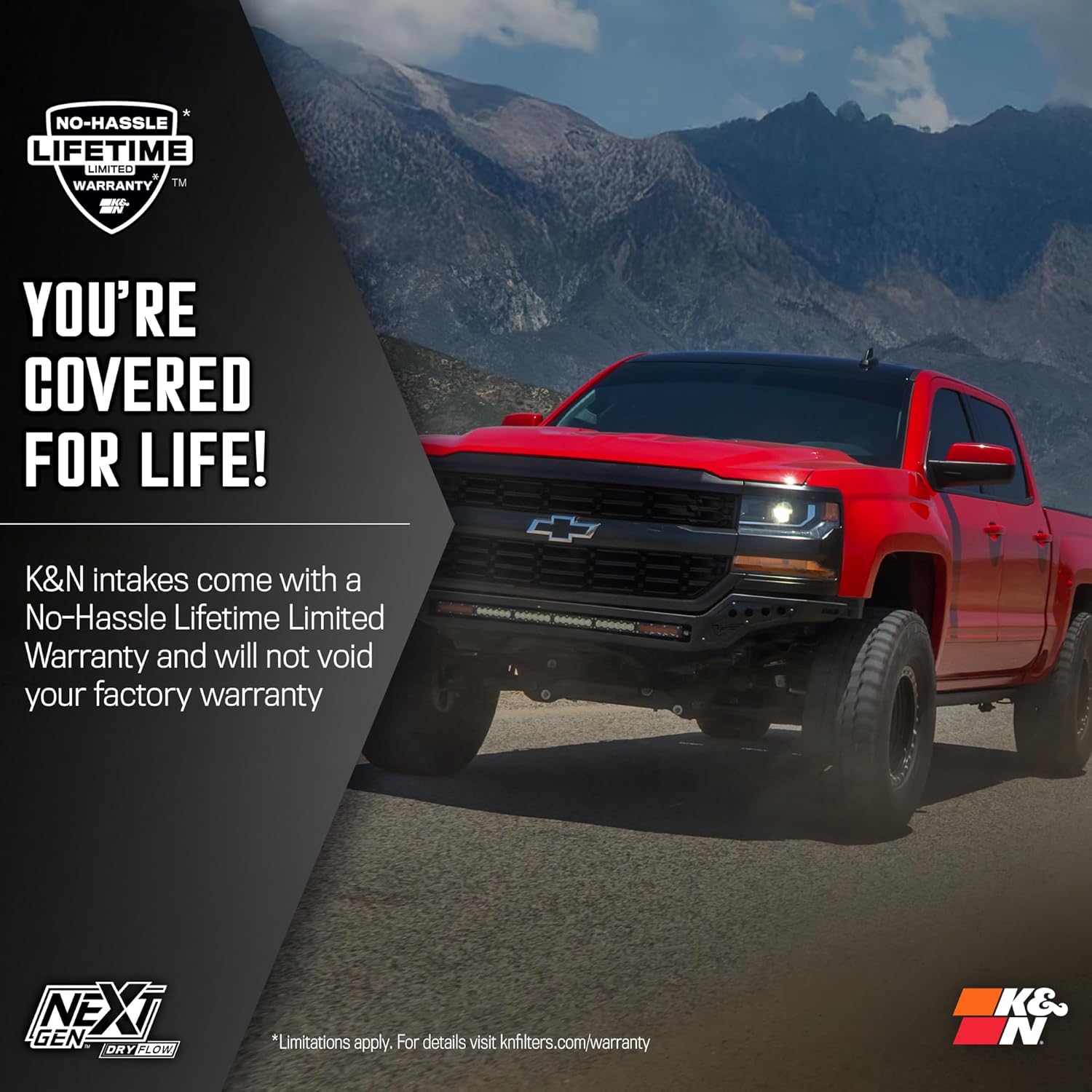 This K&N NextGen cold air intake system is engineered for Chevrolet Silverado 1500 V8 5.3L/6.2L F/I. A high-density polyethylene (HDPE) rotationally molded tube helps increase the volume of airflow by 30% CFM GAIN to your engine and provides an increase of 14.9 horsepower and 9.5 torque with no tune required. This intake system is paired with a washable, reusable Dryflow LIFETIME Air Filter featuring an oil-free synthetic media. The oversized, conical design allows you to go up to 50,000 miles between filter services under normal highway driving conditions and has an easy oil-free two step cleaning process for convenience. A custom designed NextGen air box helps protect intake air from the high temperature of your engine bay, and the entire system can typically be installed in less than 60 minutes.