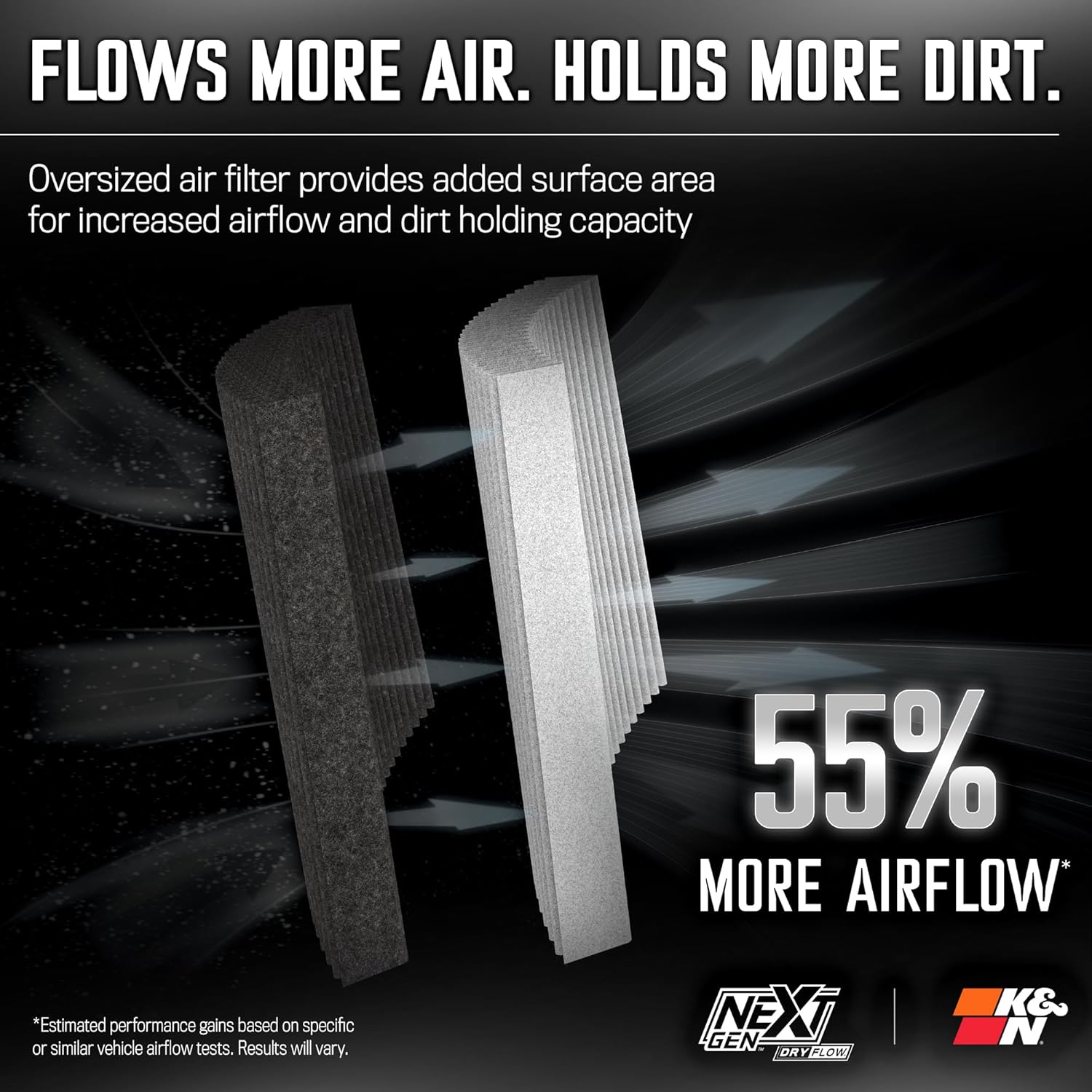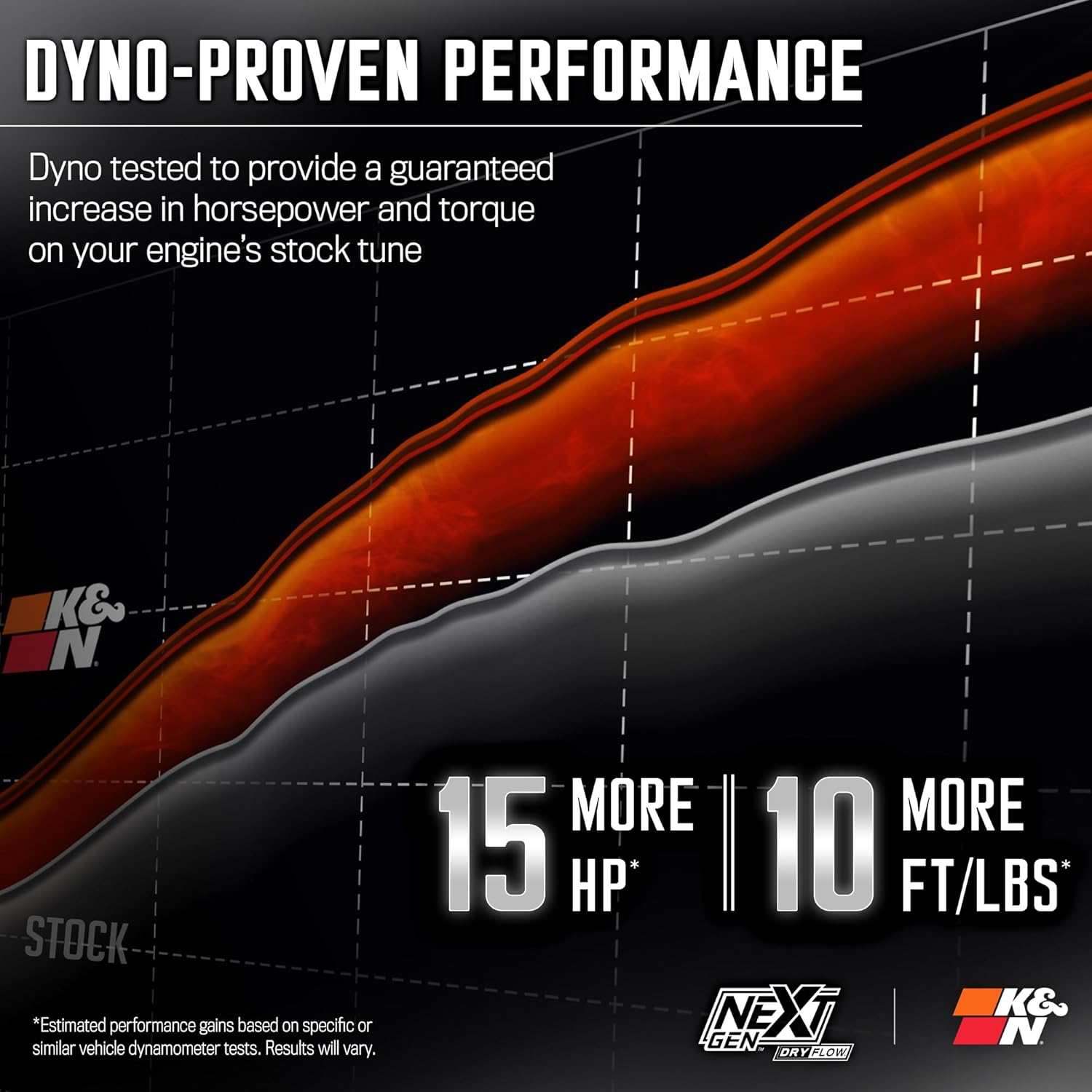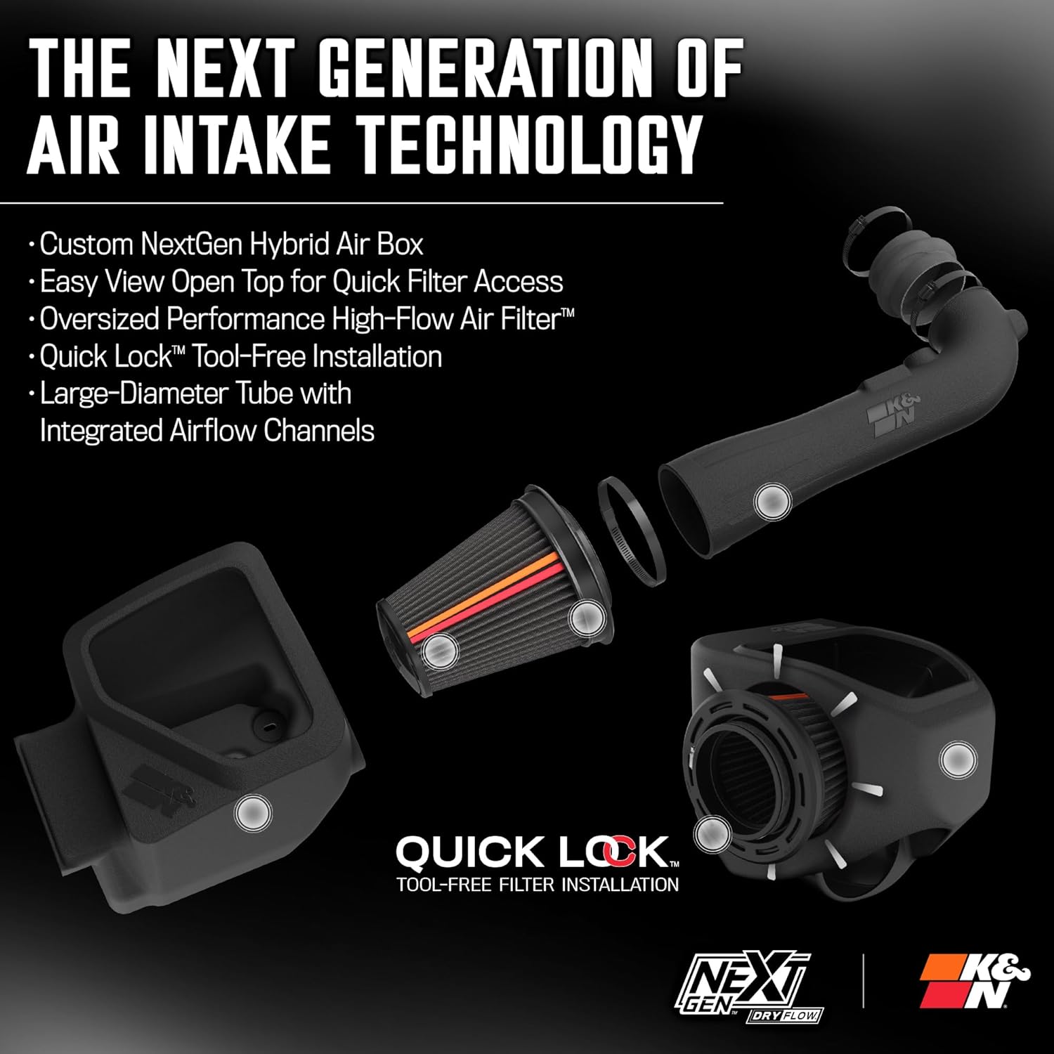 This K&N NextGen cold air intake system is engineered for Chevrolet Silverado 1500 V8 5.3L/6.2L F/I. A high-density polyethylene (HDPE) rotationally molded tube helps increase the volume of airflow by 30% CFM GAIN to your engine and provides an increase of 14.9 horsepower and 9.5 torque with no tune required. This intake system is paired with a washable, reusable Dryflow LIFETIME Air Filter featuring an oil-free synthetic media. The oversized, conical design allows you to go up to 50,000 miles between filter services under normal highway driving conditions and has an easy oil-free two step cleaning process for convenience. A custom designed NextGen air box helps protect intake air from the high temperature of your engine bay, and the entire system can typically be installed in less than 60 minutes.