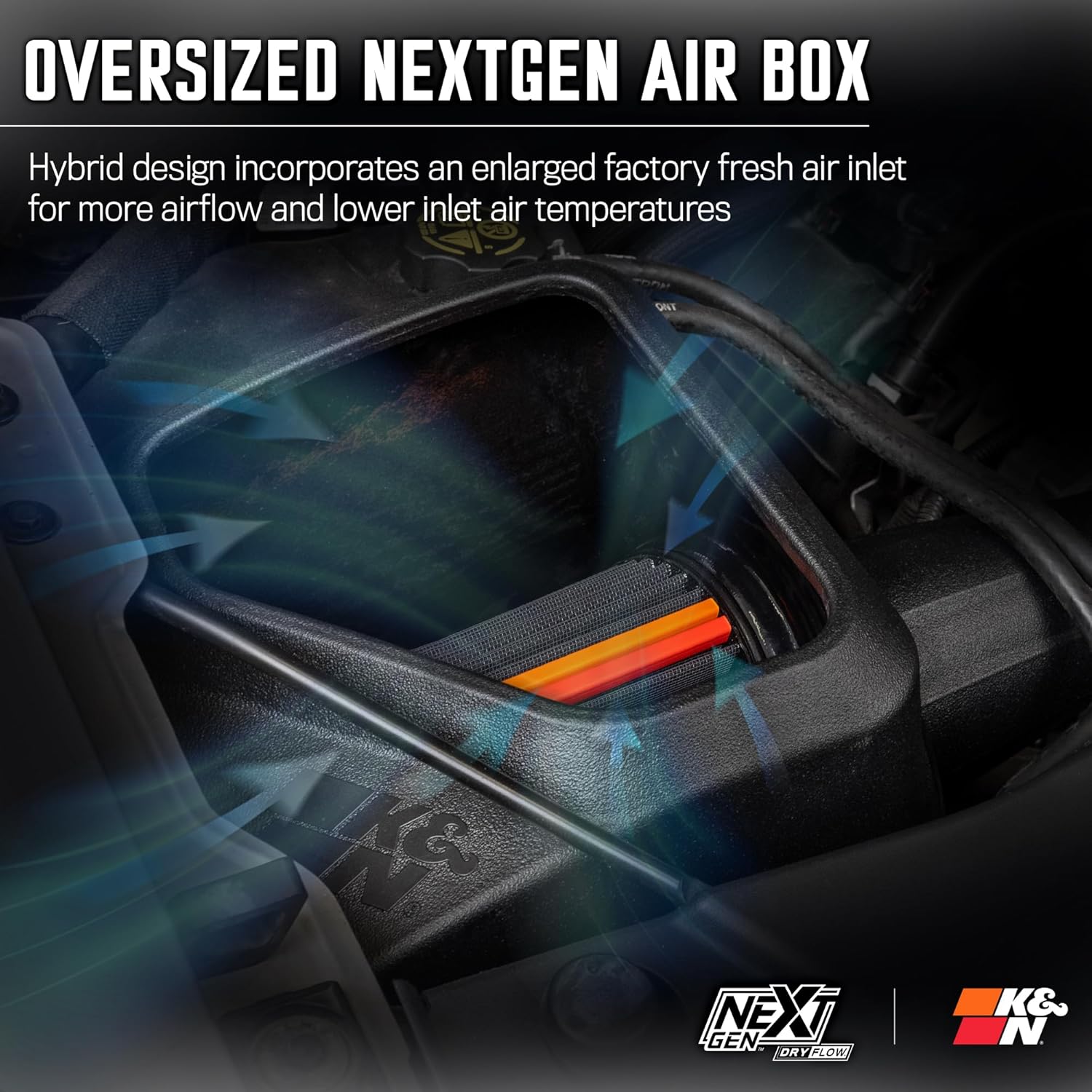 NextGen Airbox: The hybrid airbox features a semi-enclosed airbox that helps lower air temperatures, an enlarged fresh air inlet for improved airflow, and better protection against contaminants.