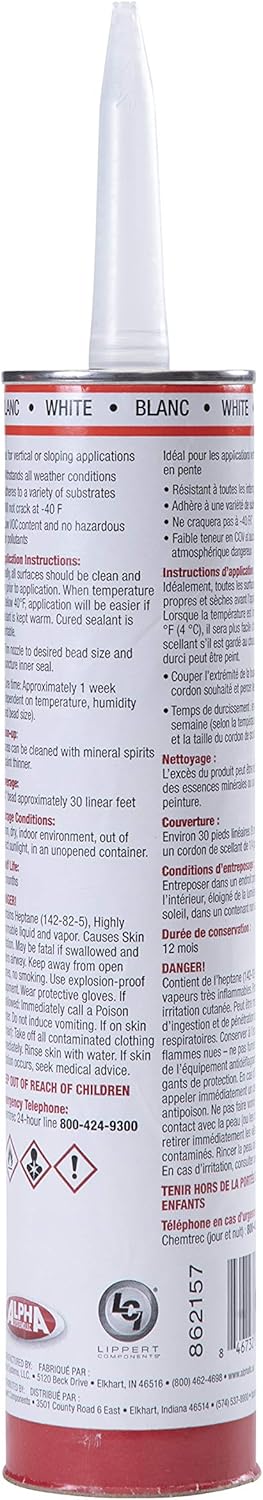 Sealing around your RV’s end rails, sidewalls and roof edging is easy when you trust the name the pros use. The Alpha Systems 1010 non-sag sealant is perfect for sealing vertical, slanted and uneven areas of your RV. This is is a high-strength, non-sag sealant designed to withstand the wear and tear of outdoor elements and block air and moisture from leaking through your roof. Plus, once it’s fully cured, it can hold up against the shock, vibrations, and stress of outdoor transportation.The 1010 non-sag sealant comes in a single tube and is available in white, beige, gray or almond color options.With Alpha Systems, you get a holistic system of premium RV repair and maintenance products all designed to work together. From our self-leveling sealants to our butyl tapes, each Alpha product is carefully formulated in our labs and tested for superior performance. Our standard is to never settle for status quo. We’re constantly raising the bar, innovating and improving our family products, in every detail. That’s why RV manufacturers, dealerships and service technicians throughout the industry trust our name when it comes to giving their customer a product they can rely on. And better yet, all of our high-quality sealants, adhesives and tapes are made in the heart of RV country, right here in the USA. Alpha Systems, trusted by the pros, formulated for your RV.Whether you’re on the road or on the water, Lippert supplies a broad array of premium RV, towing, and marine products designed to enhance all of your recreational pursuits. Our team is committed to always thinking about your next journey — pushing the possibilities of our products and services, all to better your time spent outdoors, whenever, wherever, for years to come.