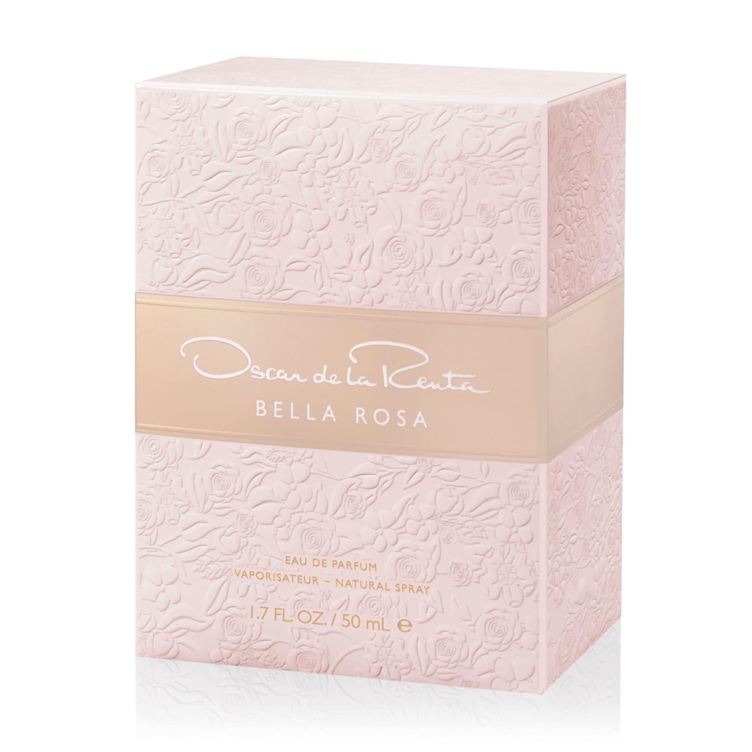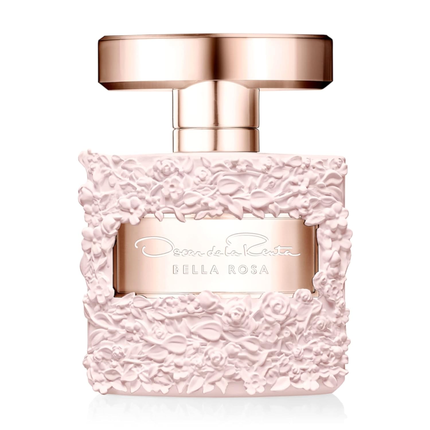 As captivating as its scent, the Bella Rosa bottle is covered in three-dimensional pale pink flowers. A rose gold plate glows in the center etched with the name of the perfume, and a metallic cap adorns the top.