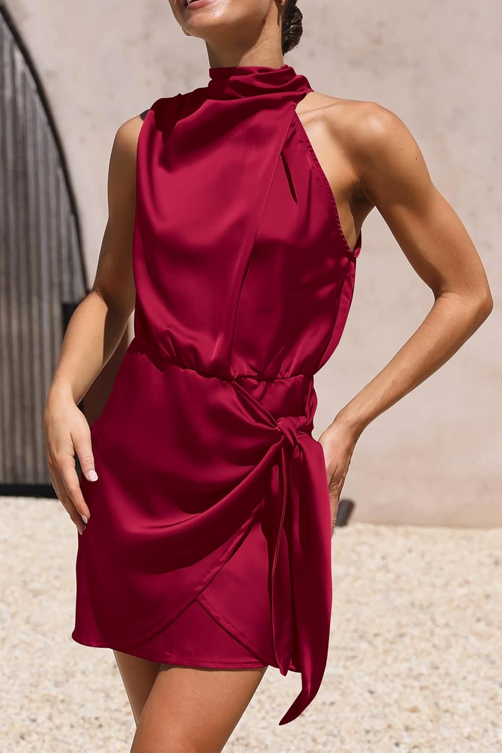 PRETTYGARDEN Women’s Short Formal Satin Dress Summer Sleeveless Mock Neck Tie Waist Cocktail Party Dresses