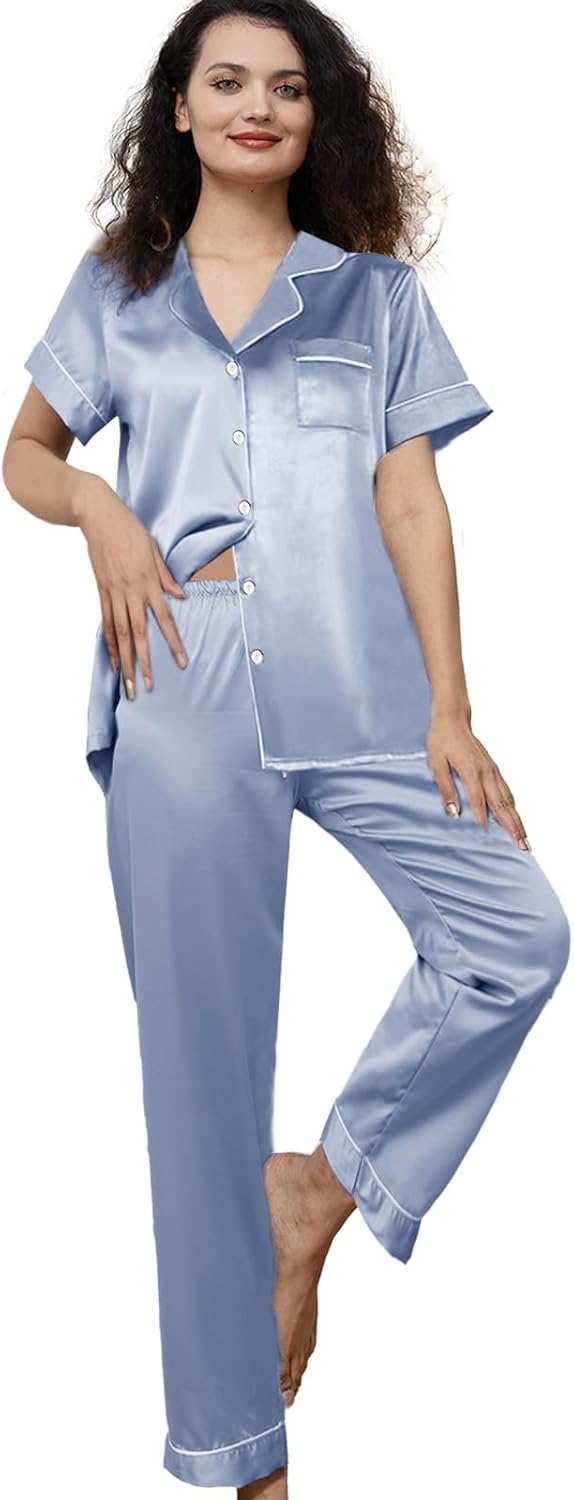 WJING YI JIA WOMENS FLORAL SILK PAJAMAS SETS SHORT SLEEVE LONG PANTS LOUNGEWEAR